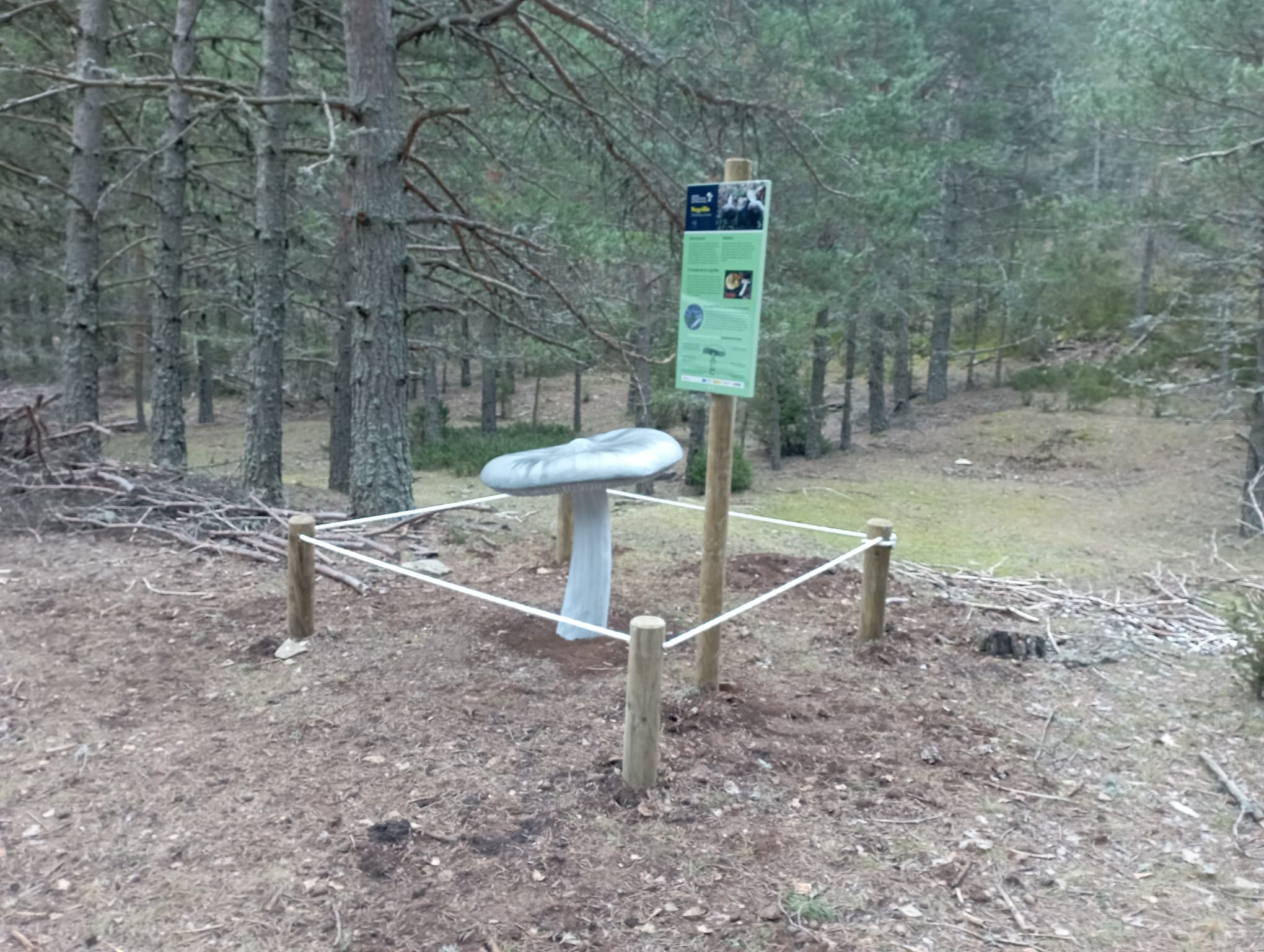 Así, a medida que se avanza, se encontrarán las reproducciones de cinco setas de un metro de altura con su respectiva información. Como en el recorrido podremos encontrar setas tanto en otoño como en primavera, las especies reproducidas son de ambos momentos, por lo que podremos localizar a la Babosa blanca, el Bujaron, la Colmenilla, la Negrilla y el Rebollón.